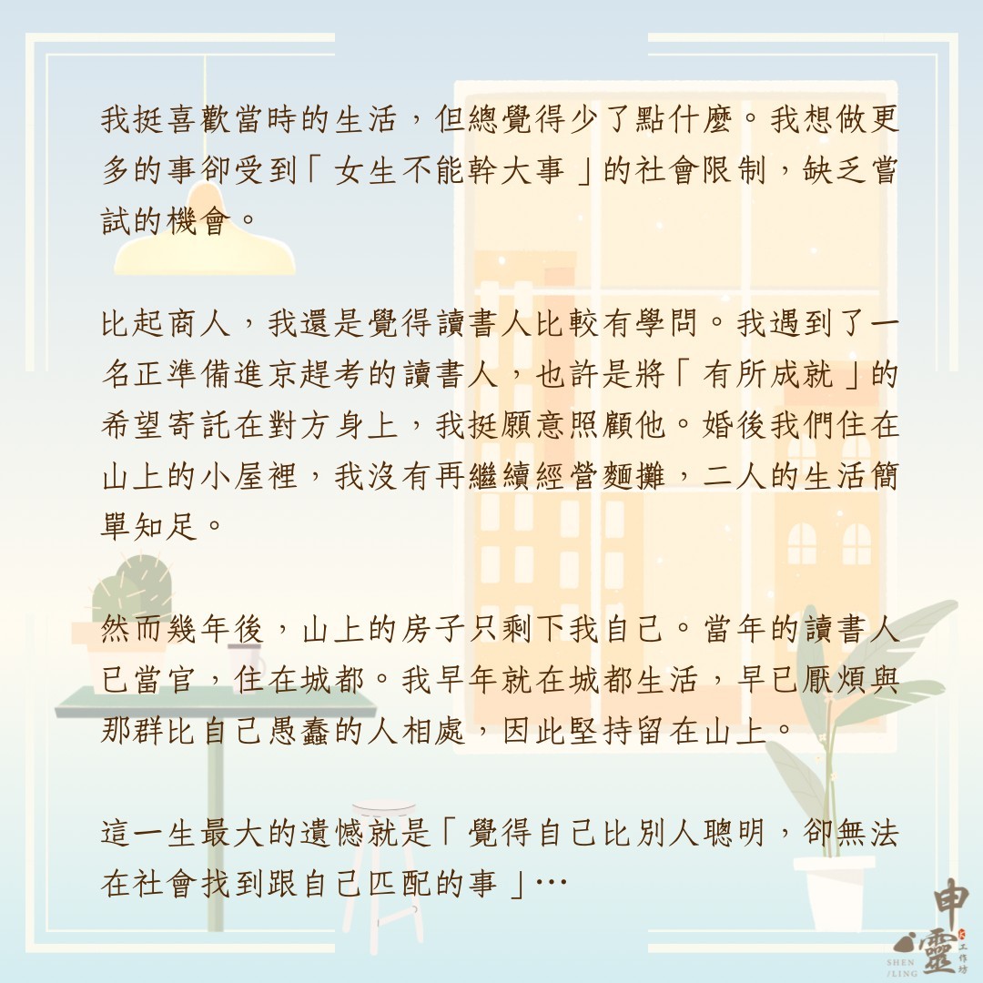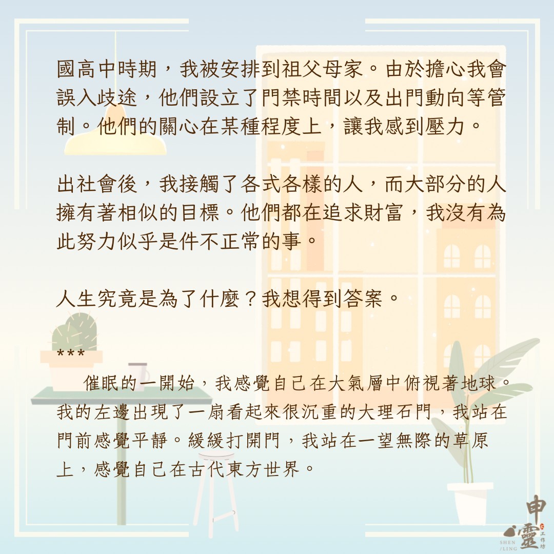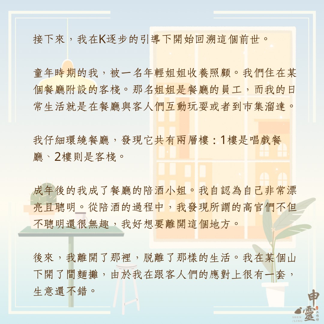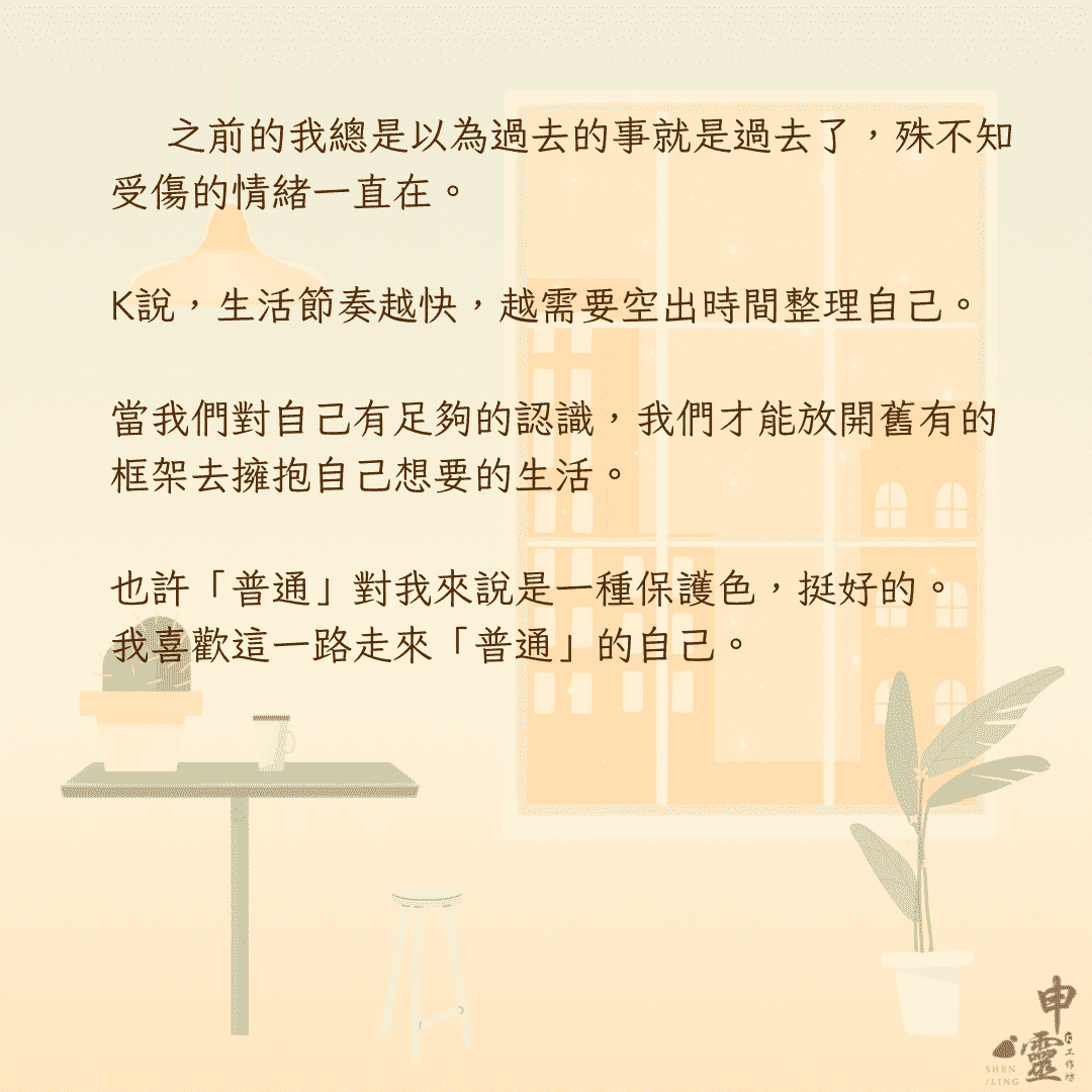 K.申靈工作坊,申是傳送之意。在生活中,我們都習慣被意識主宰,對於生活中的追求也受社會框架影響。在忙碌的生活步調裡,即使想要「好好認識自己」也成了一件難事。