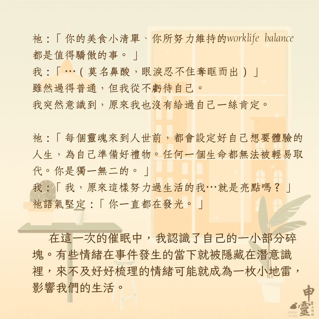 我們可以正視過往經驗留下的傷痕、可以擁抱自己,給予自己支持與力量。在潛意識世界裡,我們可以直接對內在喊話,可以鼓勵自己去追求自己想要的生活。